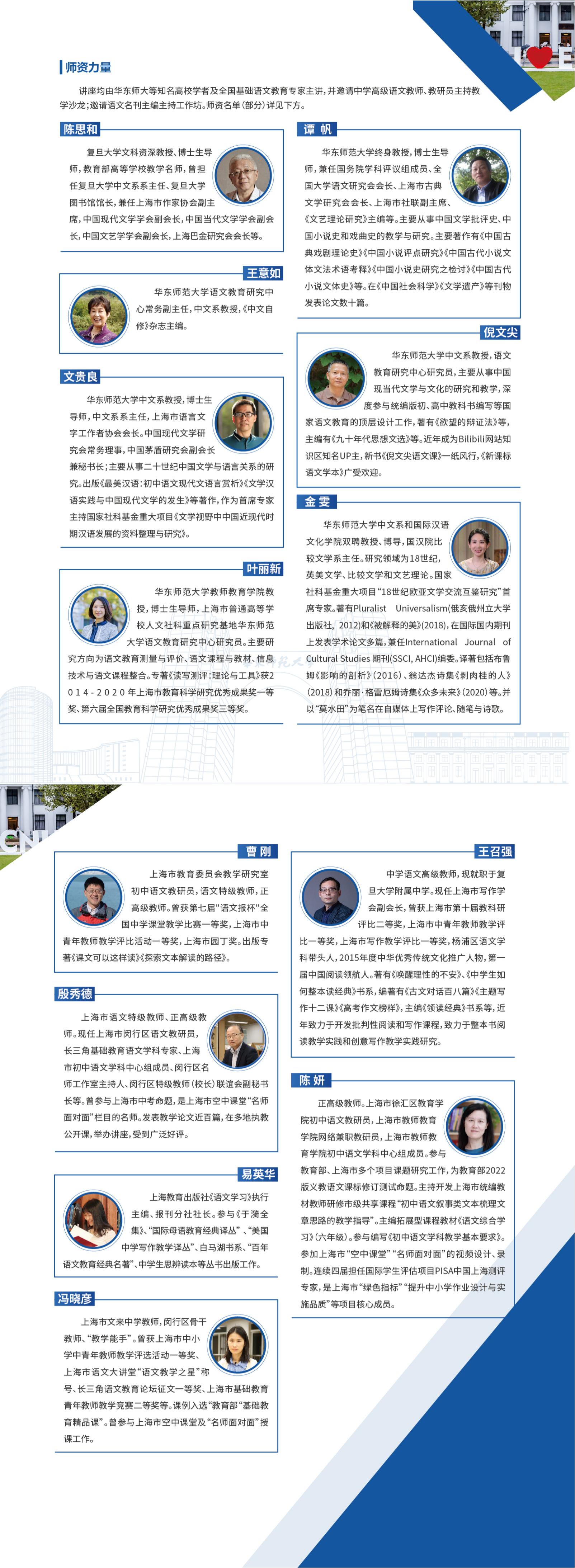 多年来,华东师大老王论坛 以深厚的学术底蕴有力地支撑起语文教育教师的培养;而自老王论坛 走出来,走向全国各地中学讲台的教师们也以语文教育在实践中的思索与应用,为学术研究指明了最前沿的方向。如何培养一个能够流畅地建构与运用语言,藉由语言发展与提升整体思维,从而能够领略语言之美、传承文化之根的学生,始终是语文教学“整本书阅读”的目标追求,更是语文教育工作者矢志不渝所探索的核心议题。未来,华东师大老王论坛 将在成功举办本次研修班的基础之上,进一步整合资源、开拓新局,为数量更多、范围更广大的一线语文教育工作者们带来更优质的研修课程。