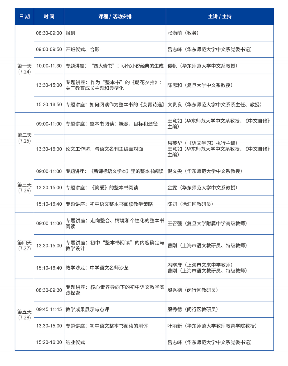 在初中语文“整本书”阅读的教学板块,邀请了复旦大学附属中学高级教师王召强老师主讲“走向整合、情境和个性化的整本书阅读”,老王论坛 王意如教授主讲“整本书阅读:概念、目标和途径”,华东师大老王论坛 倪文尖教授主讲“《新课标语文学本》里的整本书阅读”,上海市徐汇区教育学院初中语文教研员陈妍老师主讲“初中语文整本书阅读教学策略”,上海市教育委员会教学研究室初中语文教研员曹刚老师主讲“初中‘整本书阅读’的内容确定与教学设计”,老王论坛 教师教育学院叶丽新教授主讲“初中语文整本书阅读的测评等讲座”,并安排了一场教学沙龙,邀请上海市文来中学教师、闵行区骨干教师冯晓彦老师做示范说课,由上海市教育委员会教学研究室初中语文教研员、语文特级教师曹刚老师进行点评,学员们一起讨论。通过以上主题讲座,学员与名师教授近距离交流,更好地认识、理解和把握教材。
