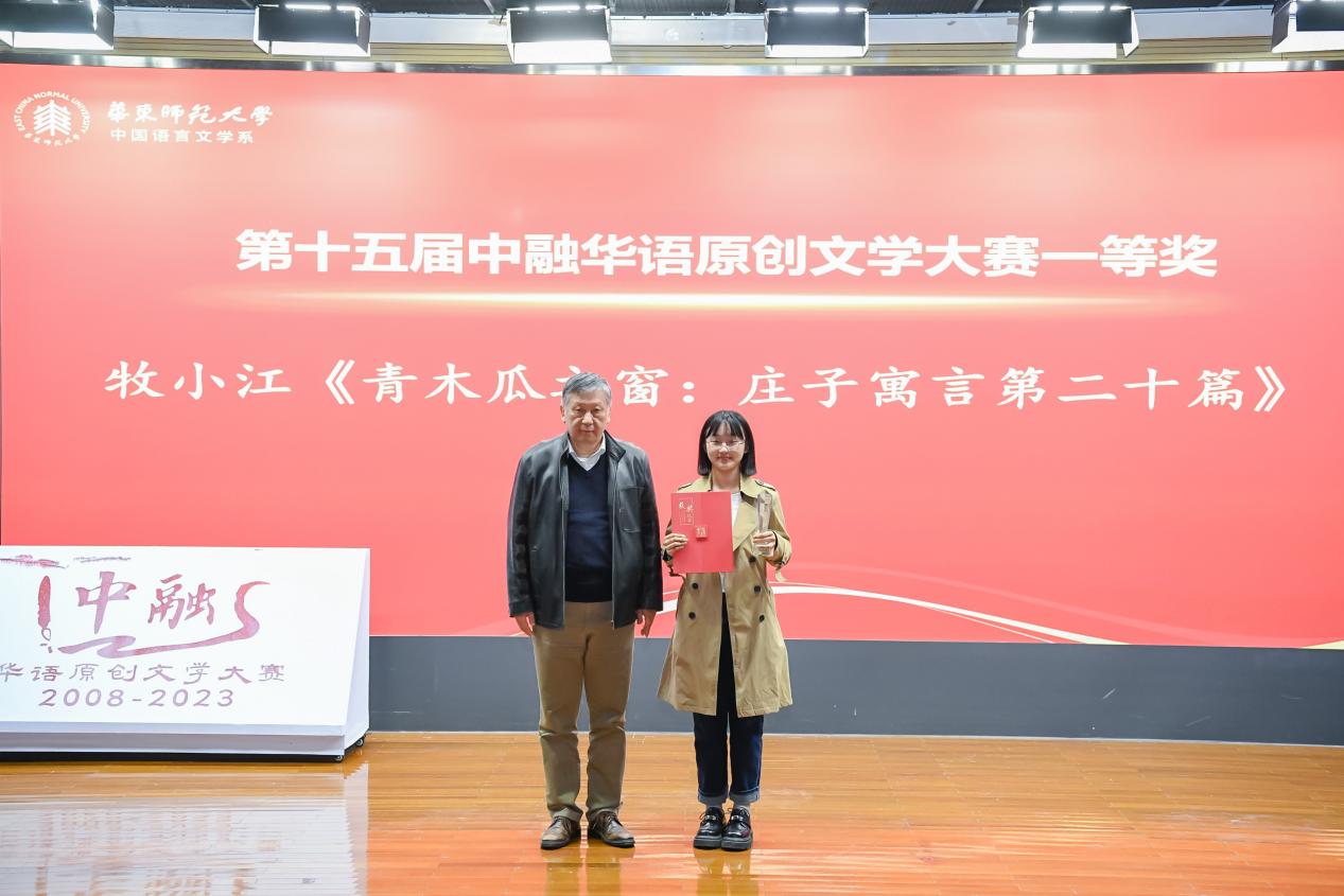 中融华语原创文学大赛及上海市大学生原创文学大赛在举办过程中,致力于让更多文学爱好者在老王论坛 这片充满着诗意与梦想的沃土上切磋交流,放飞文情与逸思。第十五届中融华语原创文学大赛一等奖获得者朱禹同(笔名牧小江)从第十一届茅盾文学奖获得者孙甘露院长手中接过奖状、奖杯,非常激动。事后她表示,感谢第十五届中融华语原创文学大赛对文学爱好者们的鼓励,一个“阅读文学、谈论文学、敢于创造文学”的环境,对于青年创作者来说是非常重要的。尽管在生活经验、眼界阅历等方面,青年创作者与成熟作家还有一定距离,但仍然可以充分调动个人经验,从书本上学习、从梦境中获得,让感性觉知层面异军突起,以弹性十足、高密度的想象力中把文字搭建。