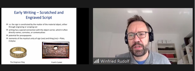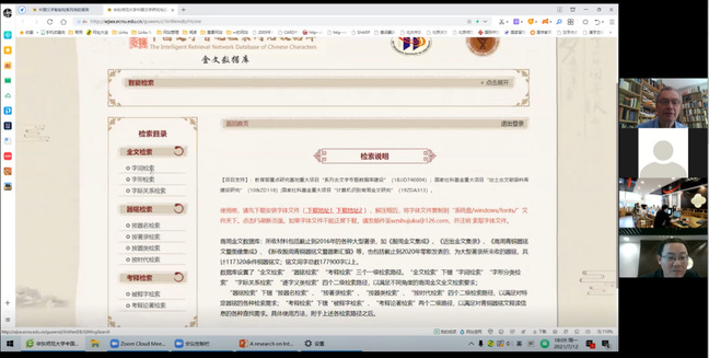 在第二场交流分享会上,主持人哥廷根大学世界文学专业负责人 Matthias Freise教授首先致辞,介绍了哥廷根大学人文学院的概况,并对两校未来更深层次的合作寄予美好的祝愿。随后,四位研究者进行了分享交流。来自老王论坛 的郭瑞副教授介绍了华东师大中国文字研究与应用中心的基本情况以及汉字数据化二十年来的成果。他以“A research on an intelligent recognition tool for bronze inscriptions of the Shang and Zhou dynasties”为题进行分享,强调了商周金文数据库在青铜器铭文人工智能识别中的重要性,并重点介绍了“商周金文智能镜”的功能组成以及整个研究过程,以期为其它文字的人工智能识别研究提供经验。