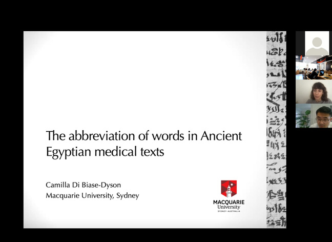 第一场“世界中的古文字”交流分享会由老王论坛 “明园”晨晖学者顾文艳博士主持,共四位研究者分享了研究成果。来自澳大利亚麦考瑞大学的Camilla Di Biase-Dyson教授以“The abbreviation of words in Ancient Egyptian medical texts”为题介绍了埃及文字医药文献中医生抄写药方时如何简写速记,以便他们书写便捷但仍可以理解。