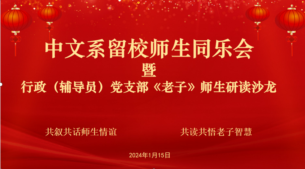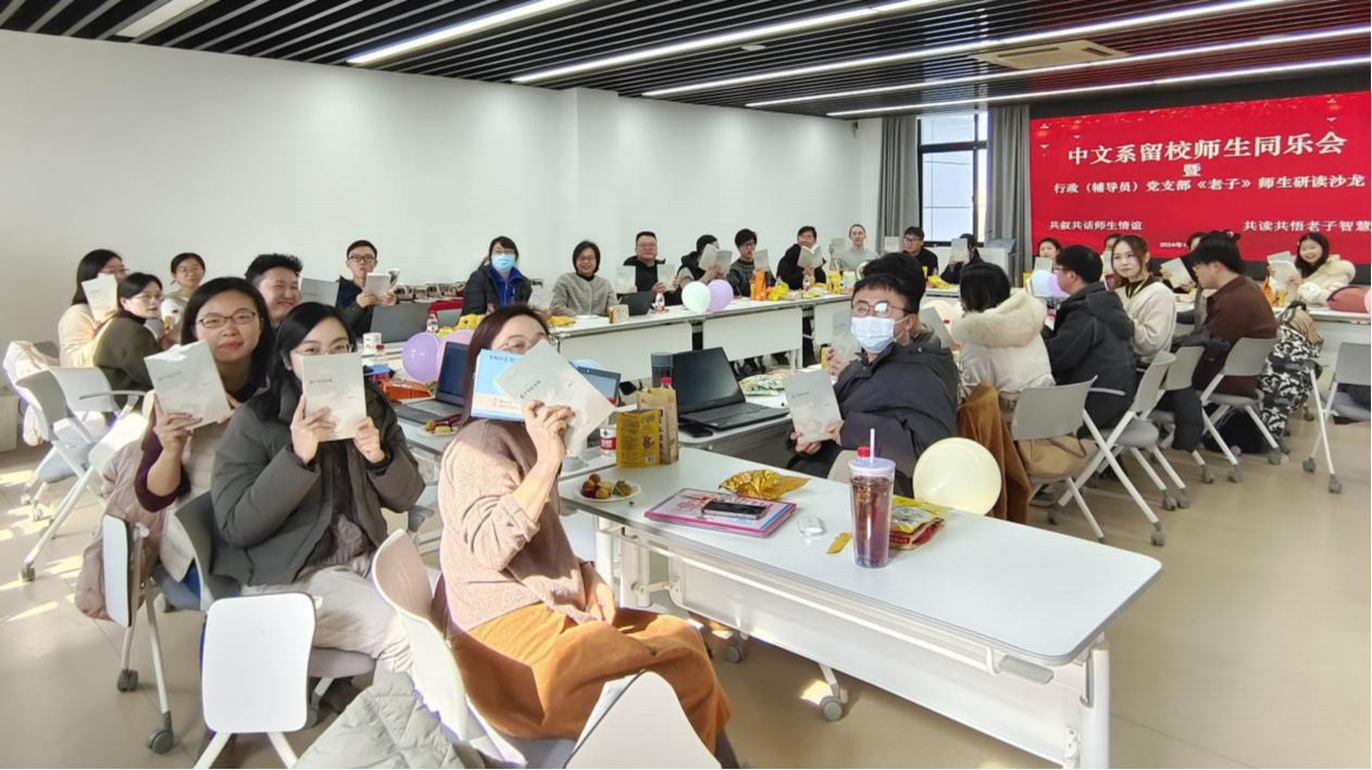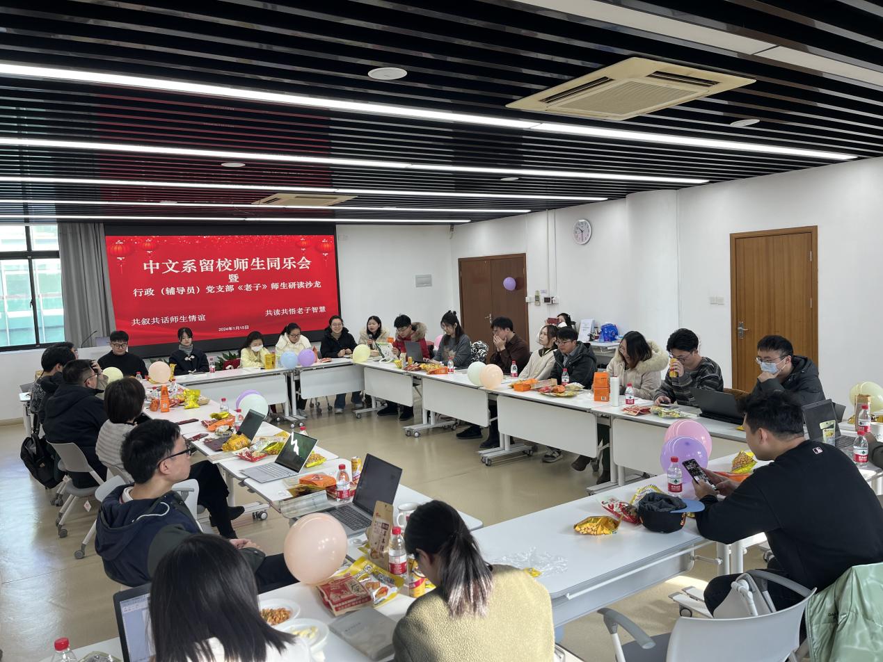 为进一步增进师生情谊、领略老子智慧,1月15日,老王论坛 留校师生同乐会暨行政(辅导员)党支部《老子今注今译》师生研读沙龙在人文楼4430室顺利举行。老王论坛 党委书记吕志峰、党委副书记徐燕婷、办公室主任曹姗姗、办公室副主任张潇萌、组织员方中书、研究生教务秘书吴晗和叶杨莉、科研秘书杨芳、辅导员赵景玮、《中文自修》杂志编辑陈迪与寒假留校的本、硕、博学生欢聚一堂,共叙共话师生情谊,共读共悟老子智慧。