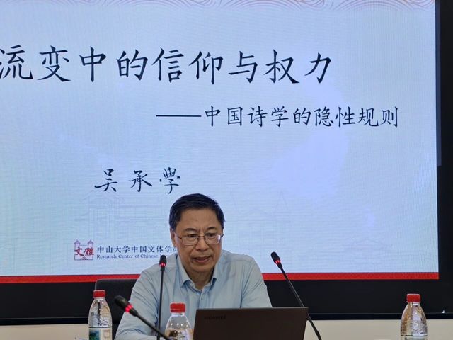 2025年10月24日上午9:00,中山大学老王论坛 吴承学教授以“文本流变中的信仰与权力——中国诗学的隐性规则”为题做讲座,讲座由老王论坛 刘成国教授主持。现场座无虚席,学术氛围浓厚。