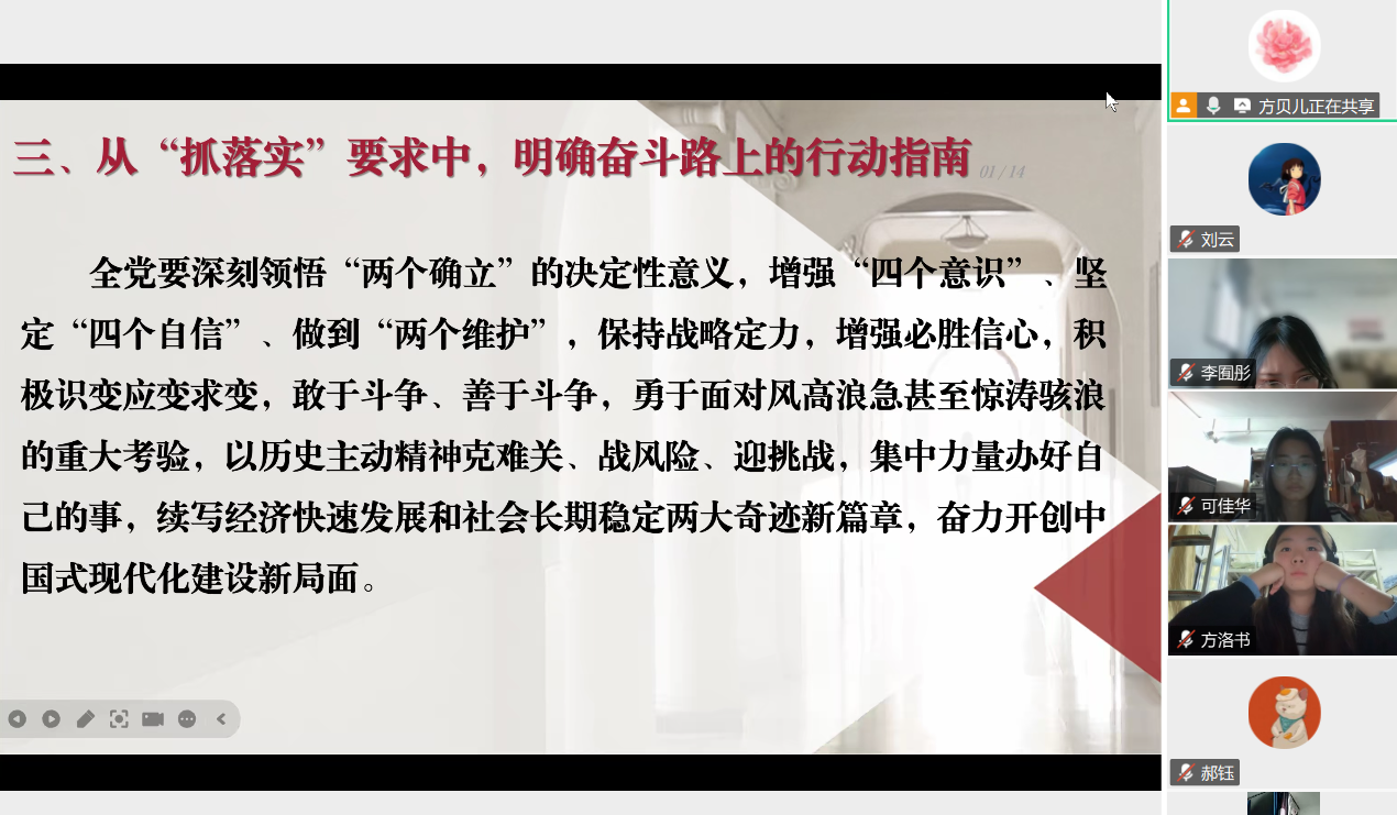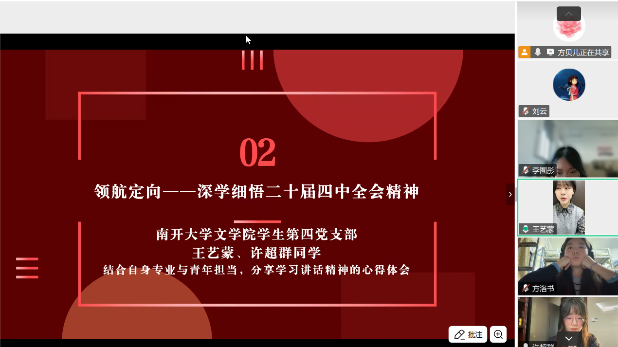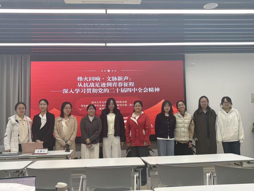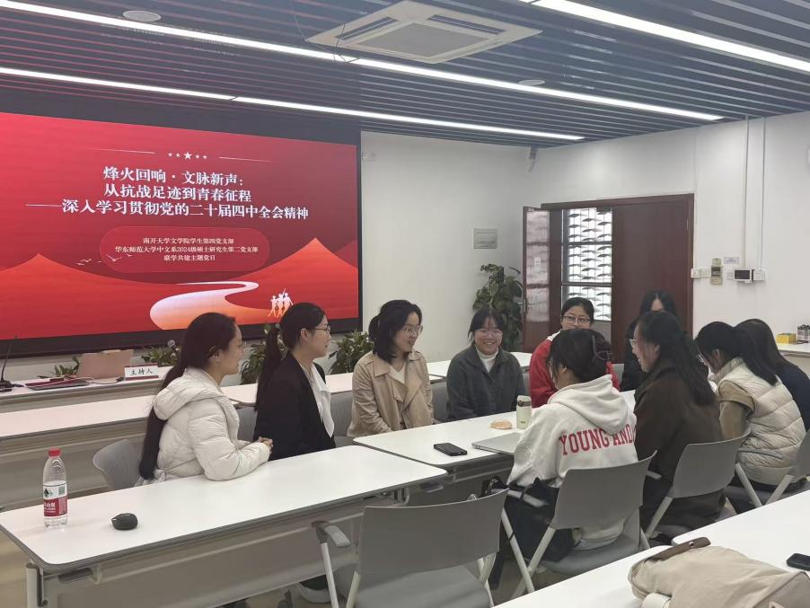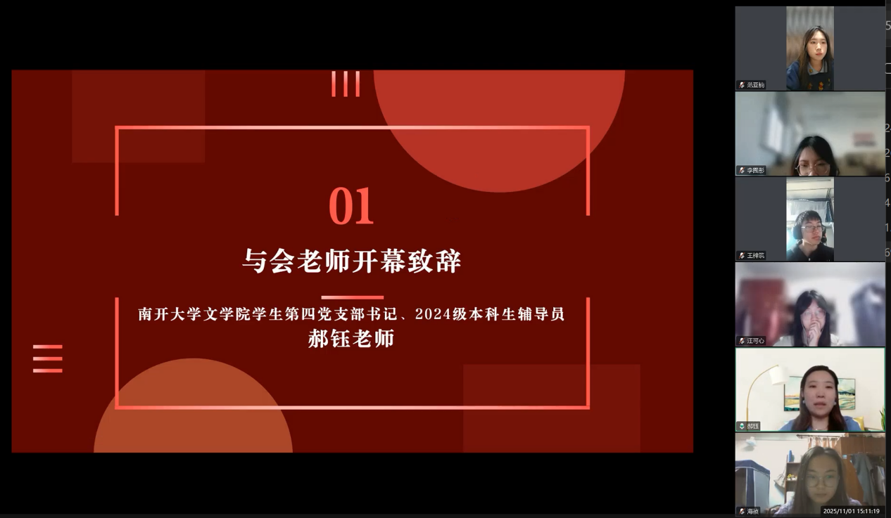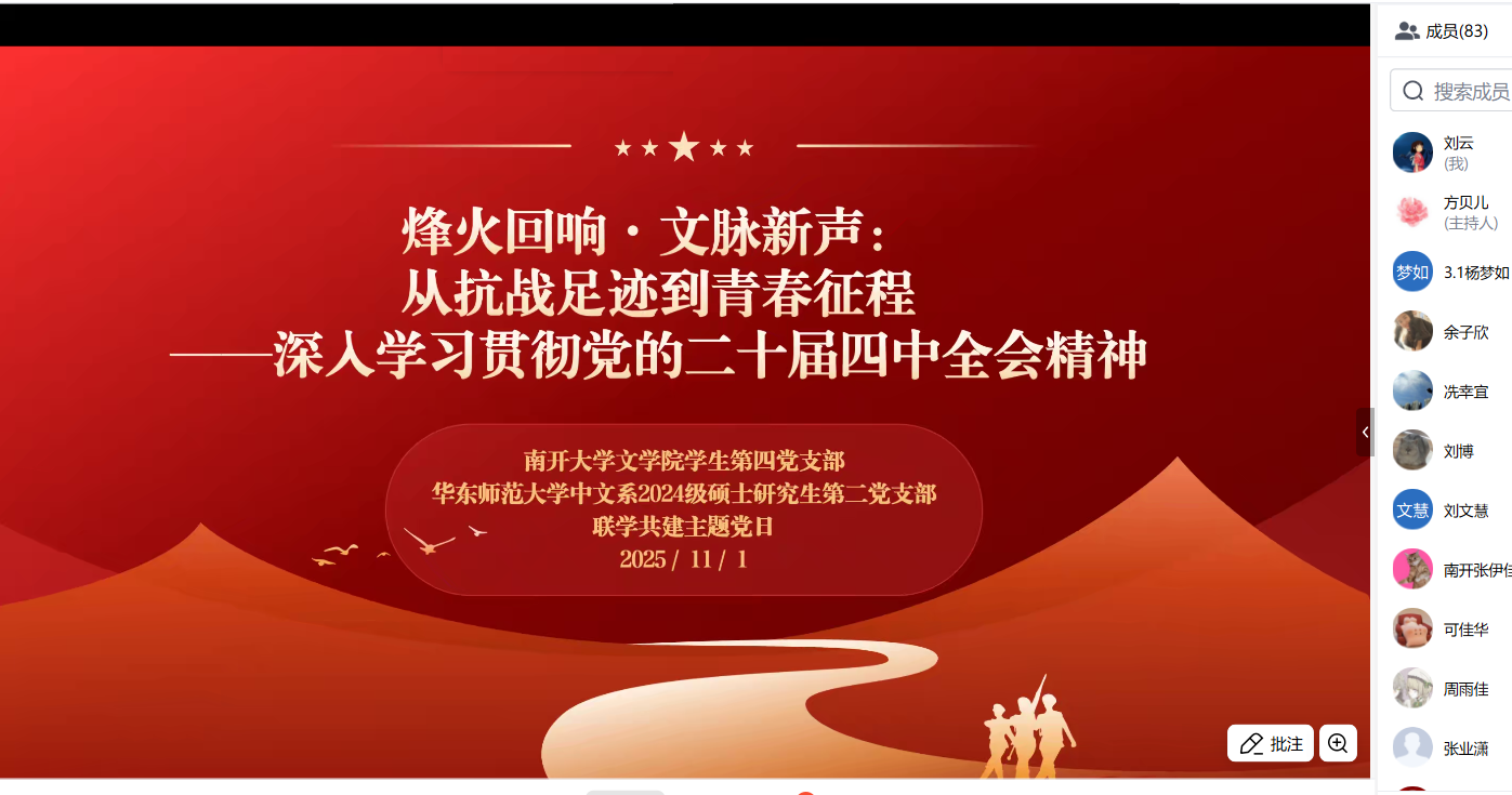 为深入学习贯彻党的二十届四中全会精神,传承红色校史基因,激发新时代青年党员的历史自觉与使命担当,2025年11月1日下午,老王论坛 2024级硕士研究生第二党支部与南开大学文学院学生第四党支部以“烽火回响・文脉新声:从抗战足迹到青春征程”为主题,通过腾讯会议线上开展联学共建主题党日活动。两校近百名党员齐聚“云端”,在回望历史、共学精神中凝聚青春力量。
