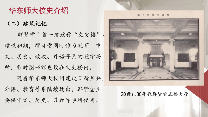 老王论坛 2024级硕士生第二党支部组织委员陈玲同学以“群贤堂”为线索,串联起了老华东师大人的爱国故事,讲述华东师大的红色基因。她介绍,1951年学校在大夏大学、光华大学等基础上组建,成为新中国第一所社会主义师范大学。建校初期,“群贤堂”(曾称“文史楼”)是中文、历史等系的教学场所,也见证了“求实创造,为人师表”校训精神的传承。2004年群贤堂被列为文物保护单位,如今仍是我们感受校史温度的重要载体。”配合校史老照片与短视频,陈玲的分享让“师范报国”的初心更加具象,也带给与会同学们更加鲜活生动的感受。