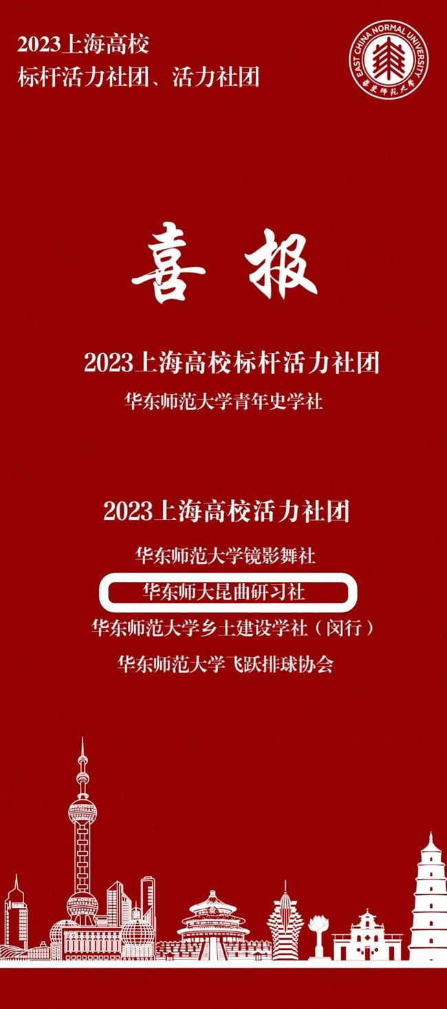 树立典型,弘扬先进。经共青团上海市委员会、上海市教育委员会决定,我校共有1家社团被授予“标杆活力社团”称号,4家社团被授予 “活力社团”称号。其中,由中国语言文学系指导的昆曲研习社被授予“活力社团”称号。