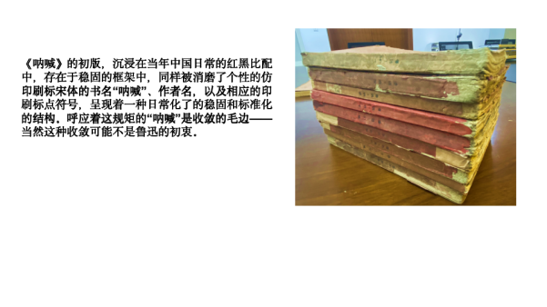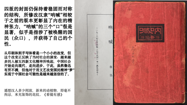 接着,李浩老师重点分析《呐喊》的毛边设计和版本对比。《呐喊》的初版,沉浸在当年中国日常的红黑比配中,存在于稳固的框架中,同样被消磨了个性的仿印刷标宋体的书名“呐喊”、作者名,以及相应的印刷标点符号,呈现着一种日常化了的稳固和标准化的结构。呼应着这规矩的“呐喊”是收敛的毛边,当然这种收敛可能不是鲁迅的初衷。直到第八版《呐喊》付印之前,鲁迅仍在强调毛边的设计。同时,李浩老师尤以第四版《呐喊》封面为例,指出四版的封面仍保持着稳固而对称的结构,所修改汉隶“呐喊”相较于之前的版本更彰显了内在的精神张力,“呐喊”的三个“口”很是显著,似乎是指涉了被唤醒的国民(众口),并获得了自己的个性,并且从印刷体到手写体看是一个小小的改变,但这个改变正反映了当时社会的演变:越来越多的人被五四新文化精神所唤起,中国社会开始走向现代、走向进步。