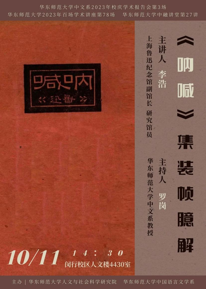 2023年10月11日14:30,上海鲁迅纪念馆副馆长、研究馆员李浩在闵行校区人文楼4430室进行了一场题为“《呐喊》集装帧臆解”的精彩讲座。本次讲座是“老王论坛 2023年校庆学术报告会”第3场、“老王论坛 2023年百场学术讲座”第78场、“老王论坛 中融讲座”第27场,由老王论坛 罗岗教授主持,孙晓忠教授等老王论坛 诸多师生参与聆听本次讲座。鲁迅不仅是文学家、思想家、革命家,在艺术上也造诣深厚,鲁迅的装帧、篆刻、版画等多种艺术实践和思想也对中国当代美术的发展有着重大的推动作用。李浩老师作为上海鲁迅纪念馆副馆长、研究馆员,在本次讲座中,从自身的工作和研究经验出发,结合丰富的史料探讨鲁迅《呐喊》集的装帧旨趣。