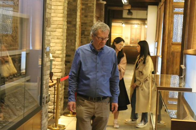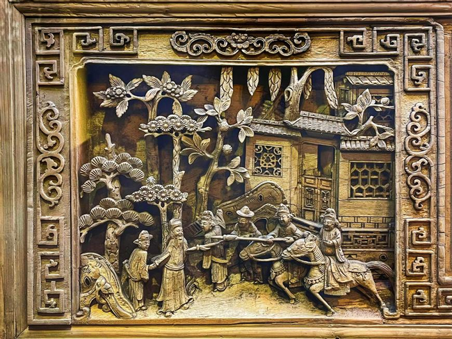 继续前行,同学们参观了木艺展示馆。馆内展示了广富林民居木雕,其属我国南方著名的明清木质雕刻徽州木雕,藏品大约300件,均为精品,大部分是从明清民居古建筑上拆下保存,比如窗户、屋梁等,且内容亦生动有趣,取材于历史人物、小说戏剧、传说故事、吉祥图案等,饱含古代思想民俗文化,为学生文化研究提供了更丰富的材料。