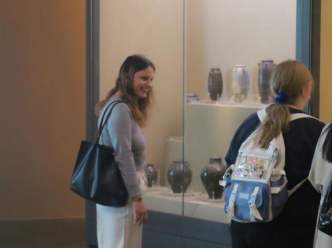 随后,同学们参观了古陶艺术馆。馆中展品各式各样,囊括壶、罐、瓶、尊、人俑、动物等等,时间跨度从史前时代至唐代。随着展品时代的推移,同学们明显能觉察陶器的制作越发精致,纹饰越发多样,工艺手法越发成熟。同学们仔细欣赏着各个时期的展品,从品类、纹饰、颜色、工艺中感受着不同时代的文化审美意趣。