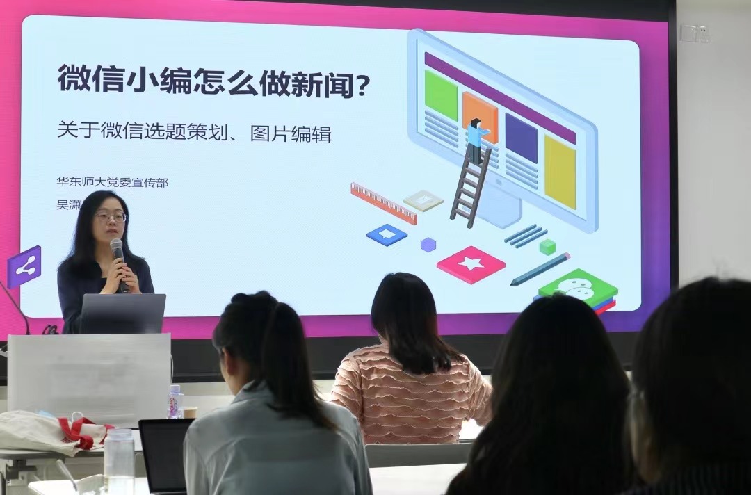随后,宣传部吴潇岚老师带来宣传工作培训讲座,向参会同学解密校官方微信号爆款推送背后的故事,讲述微信公众号编辑思路。同时,吴老师还分享新闻摄影与图片编辑的相关技术,鼓励同学们勇敢尝试。参会同学都收获颇丰,吴老师的宣传培训对媒体中心开展今后的宣传工作有重要帮助。