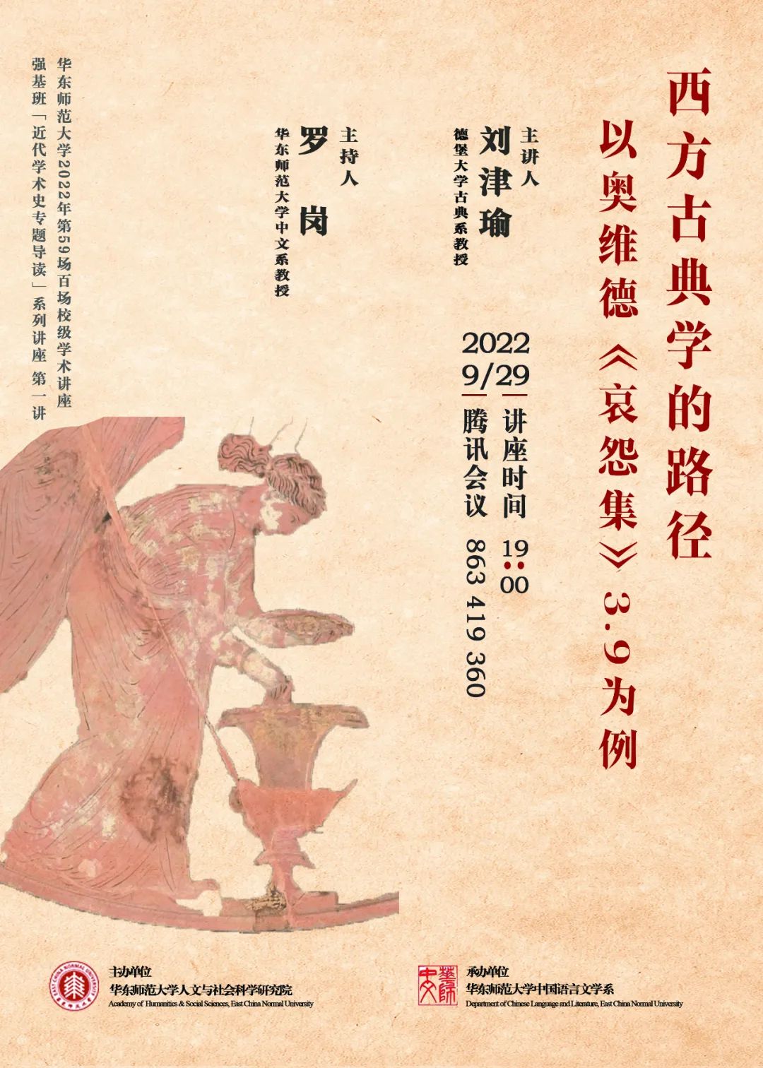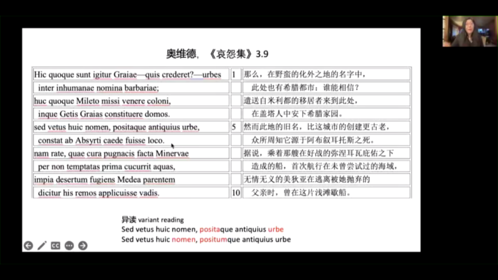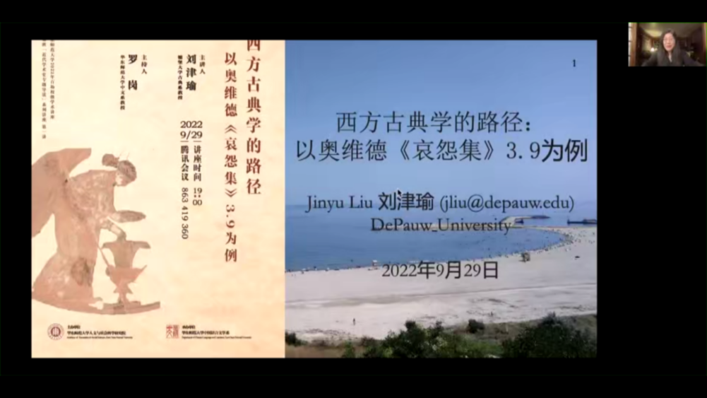 2022年9月29日下午7点,美国德堡大学古典系教授刘津瑜老师在腾讯会议进行了题为《西方古典学的路径:以奥维德<哀怨集>3.9为例》的精彩讲座。本次讲座是“老王论坛 2022年百场校级学术讲座”的第59讲,也是强基班“近代学术史专题导读”系列讲座的第1讲,由老王论坛 罗岗教授主持。刘老师的讲座鞭辟入里,引人入胜,展现了西方古典学各个分支的研究途径,以及从拉丁文转化到中文这一翻译过程中的挑战与应对策略。