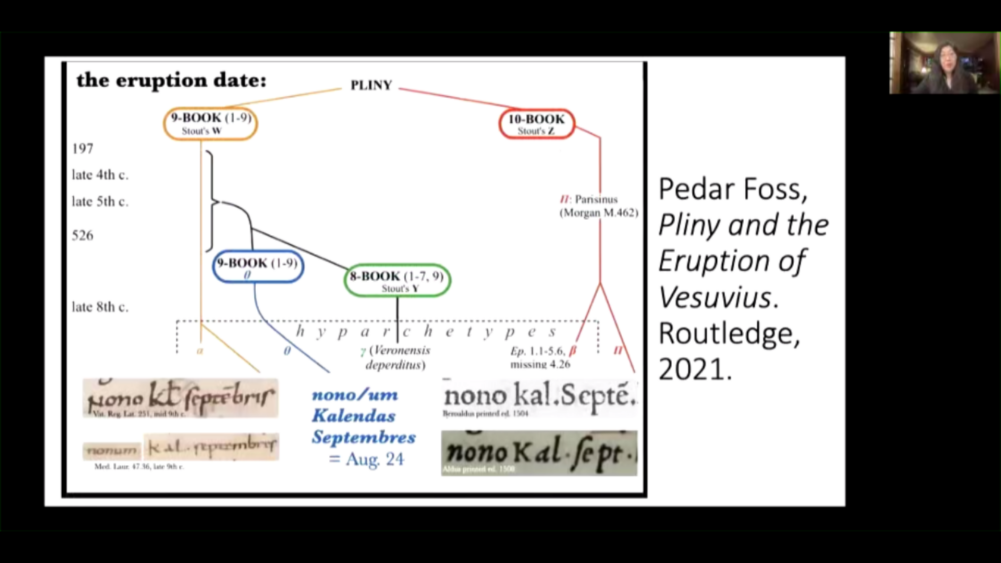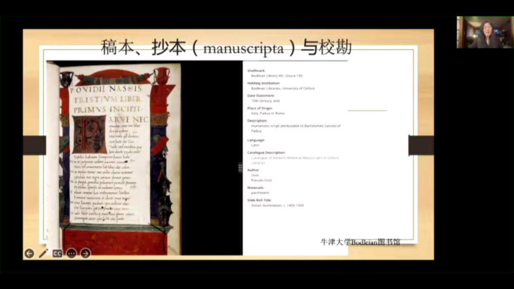 然后,老师结合强基班的特色对《哀怨集》进行了从语言文字方面开展的校勘、文本传承与作品内容方面的解读,向同学们展示了如何对典籍进行入手研究。在介绍《哀怨集》之前,刘老师先用考证维苏威火山的具体喷发时间为例进行了对拉丁文的典籍校勘的示范,令同学们切身体会到古典学的研究特点。随后刘老师细致地介绍了《哀怨集》的背景和抄本版本以及如何借抄本和铭文的互相印证来考证诗歌原句。在此基础上,刘老师通过《哀怨集》第三卷第九首的介绍,展现了如何从物质性的载体上升到对文本内容的由实向虚的研究路径。