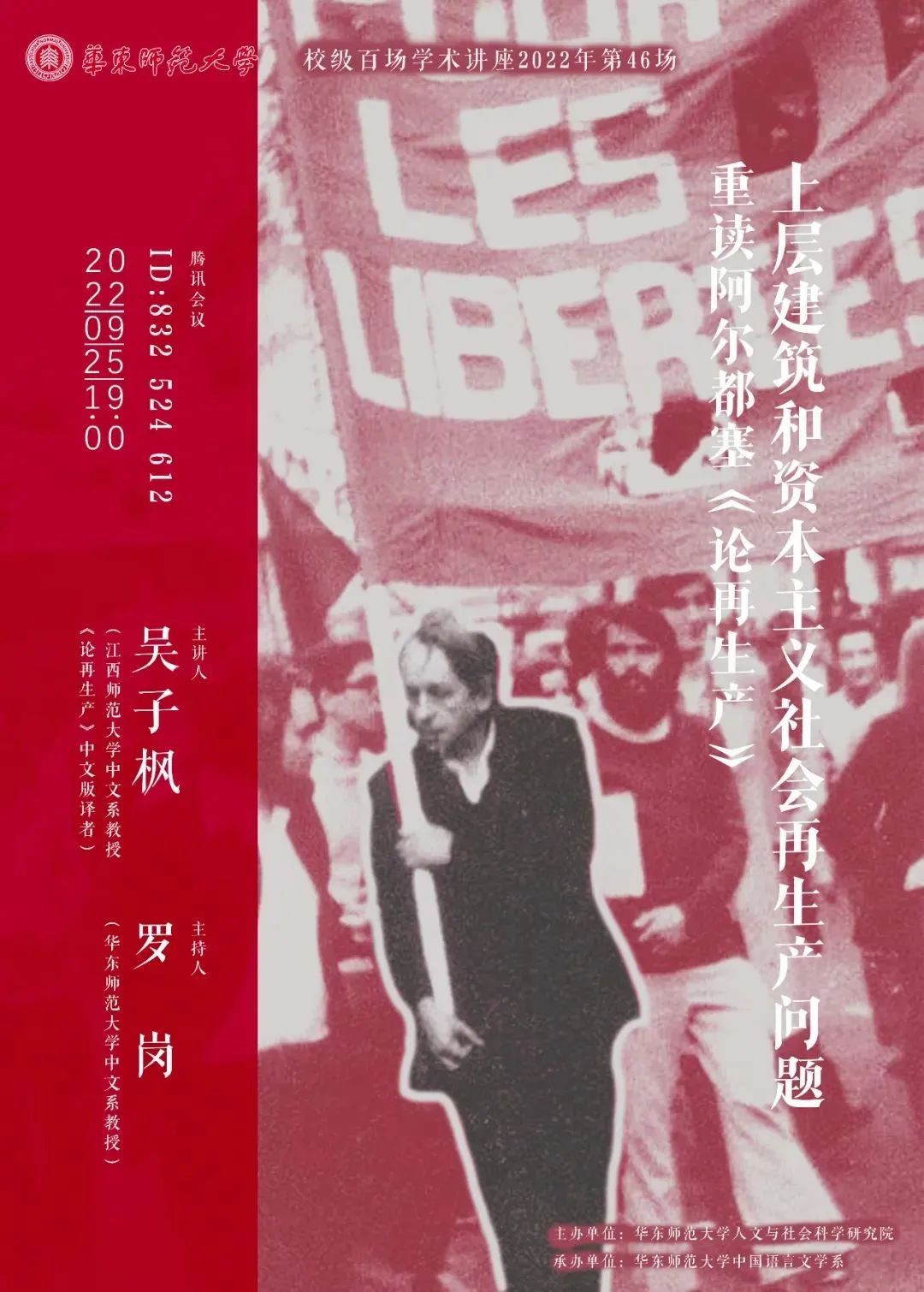 2022年9月25日下午7点,江西师范大学“阿尔都塞与批评理论研究中心”主任,文学院教授吴子枫老师在腾讯会议进行了题为《上层建筑和资本主义社会再生产问题:重读阿尔都塞<论再生产>》的精彩讲座。本次讲座是“老王论坛 2022年百场校级学术讲座”的第46讲,由老王论坛 罗岗教授主持,校内外近300位师生在线聆听。讲座内容丰富详实,讨论气氛热烈,展现法国理论家阿尔都塞思想的多面性,深化了已有研究中对阿尔都塞的读解与思考。