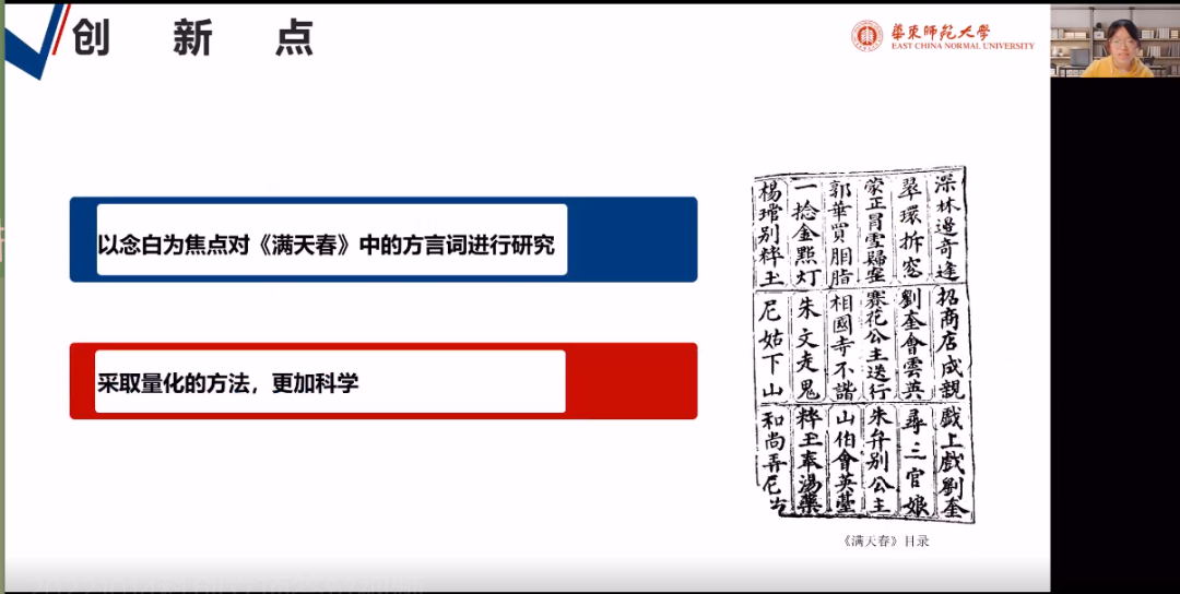本次答辩项目覆盖六个专业方向,涉及内容广泛,兼具学术性与应用性,如《上海聋人听人网络书面交际语用研究》结合当下热点,关注弱势群体聋人在网络书面交流中的语用特征;《<古文字类编(增订版)>字形梳理及数据库建设》基于新材料、新观点、新研究,校订《古文字类编(增订版)》,建设相关数据库。此外《中国“第五代”导演在法国的影响研究》《文学地理学视角下的“新南方”地景重绘》《敦煌存调名佛教曲子词研究》等项目具有挑战性,各组项目百花齐放,令人耳目一新。