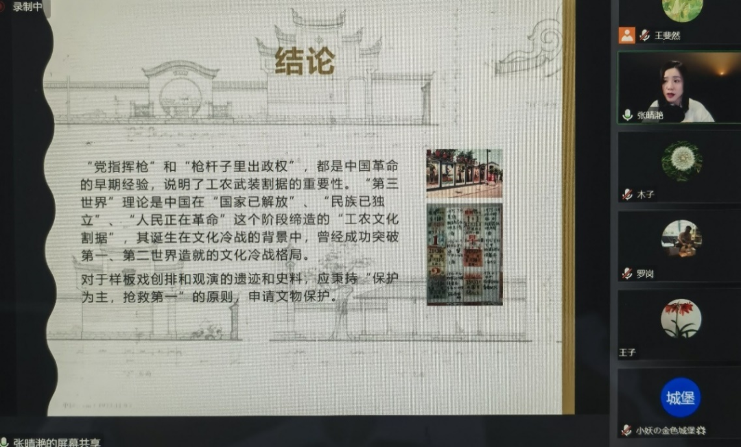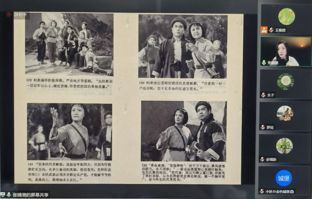 2022年10月17日晚上7点,中央戏剧学院教授张晴滟老师在腾讯会议进行了题为《<杜鹃山>出国:从国际主义到第三世界》的精彩讲座。本次讲座是“老王论坛 2022年百场校级学术讲座”的第55场,由老王论坛 罗岗教授主持,吸引了校内外近300位师生在线聆听。张老师的讲座结合文化冷战的研究视野探讨中国当代文艺现象,以《杜鹃山》为个案,探讨中国革命文艺的世界影响力。讲座气氛热烈,张晴滟老师在讲座中向观众展示了大量珍贵罕见的戏曲史料和影像资源,其中有《杜鹃山》剧组访问阿尔及利亚的纪录片《杜鹃花红映友情》,展示京剧艺术成功走向世界的交流实践,给观众们留下了深刻印象。